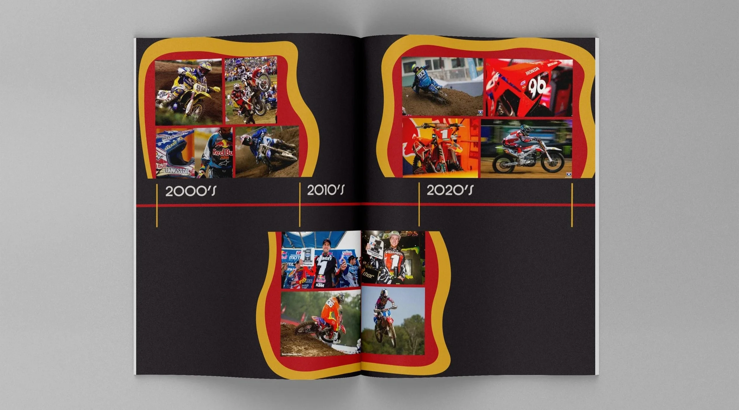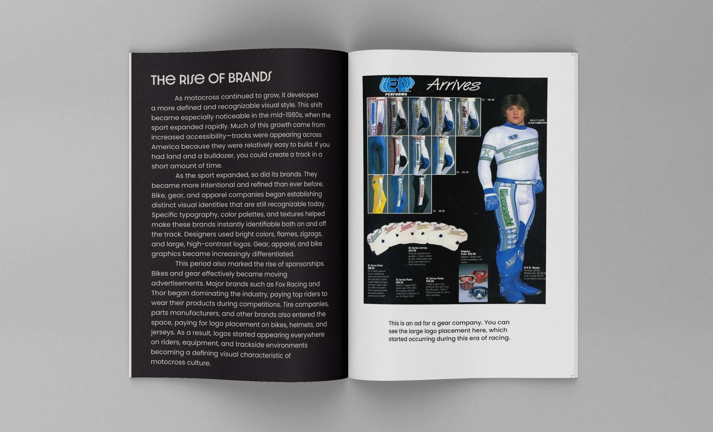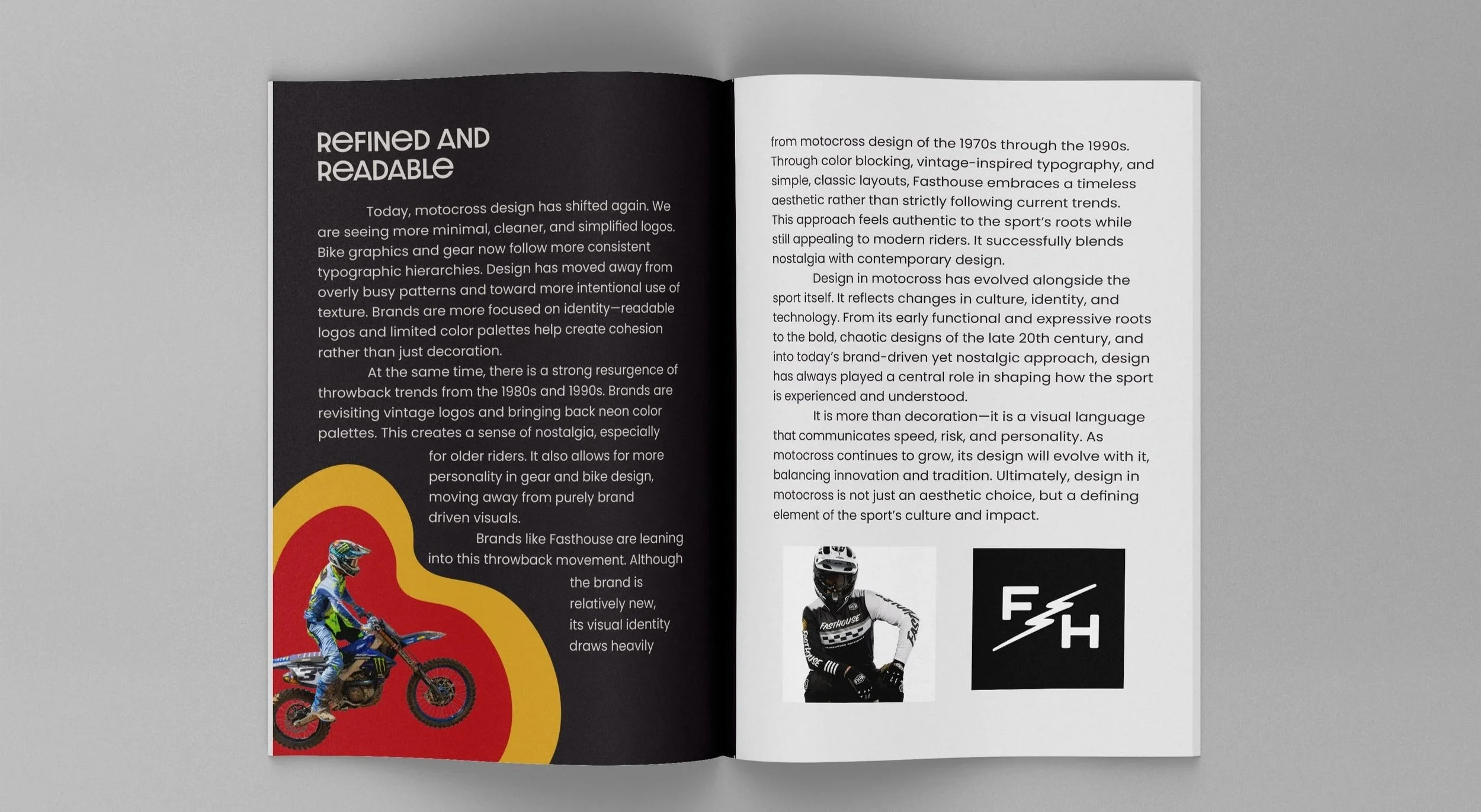 Motocross has been a major influence on both my life and my work as a designer. Growing up around the sport, I was inspired by the bold bike graphics, logos, and branding that shaped its culture. As motocross evolved from its laid-back 1970s roots to today’s clean yet nostalgic aesthetic, design has remained central to its identity. This project explores how the sport’s visual language has changed over time and how it continues to inspire my creative approach.