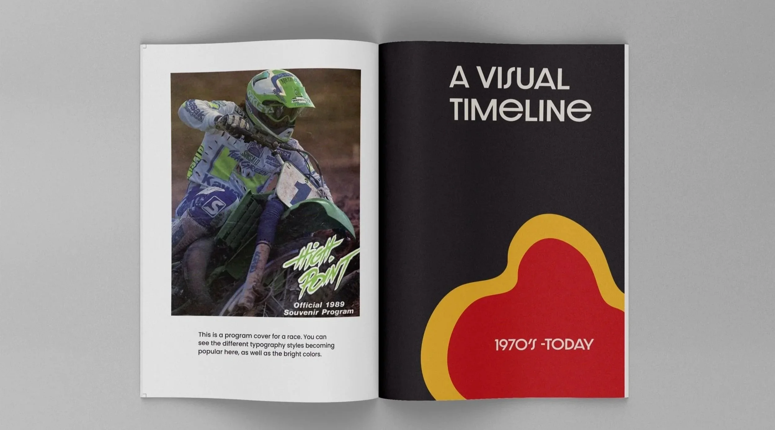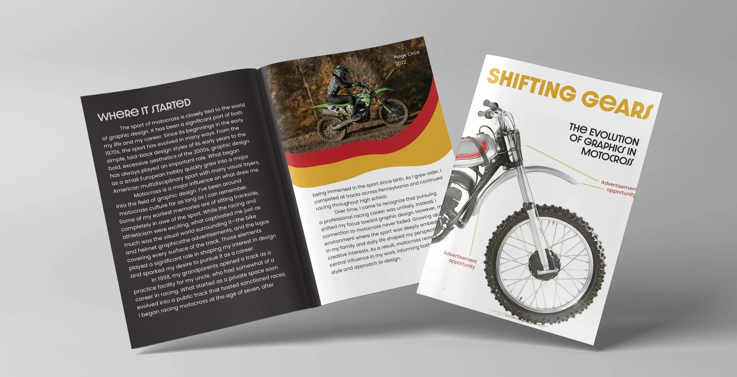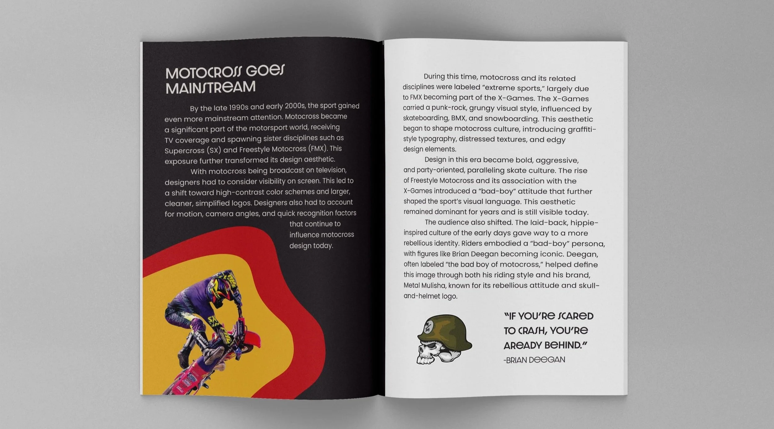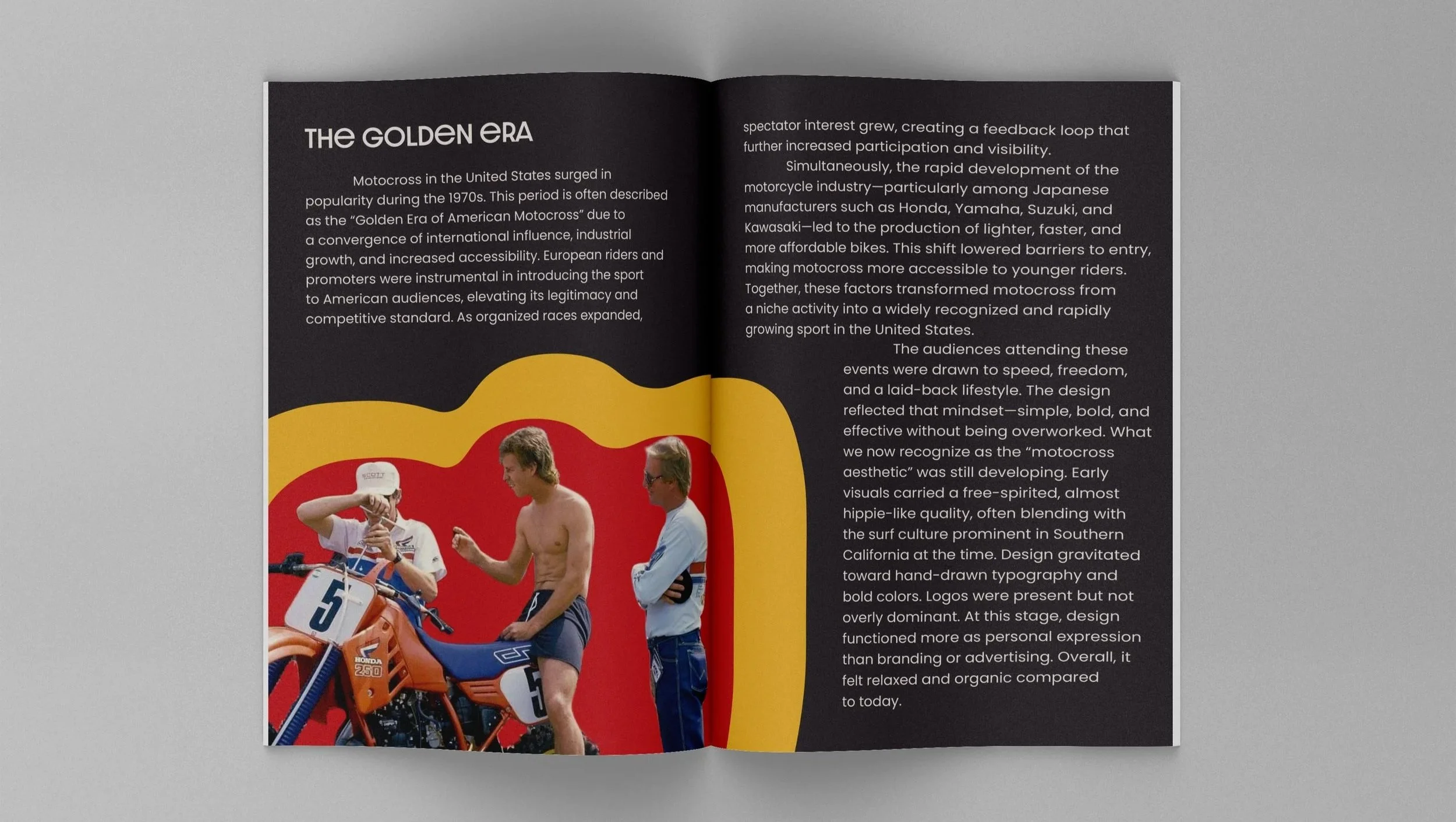 Motocross has been a major influence on both my life and my work as a designer. Growing up around the sport, I was inspired by the bold bike graphics, logos, and branding that shaped its culture. As motocross evolved from its laid-back 1970s roots to today’s clean yet nostalgic aesthetic, design has remained central to its identity. This project explores how the sport’s visual language has changed over time and how it continues to inspire my creative approach.